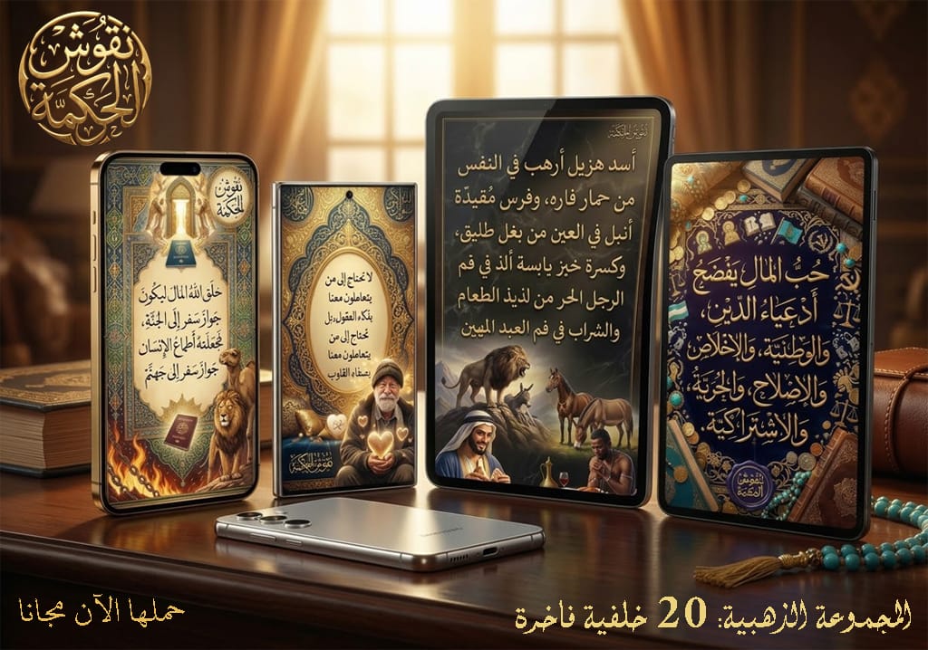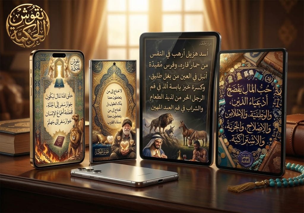 طابع فني وفلسفي عميق: ابتعدنا عن التصاميم التقليدية والمستهلكة، وركزنا على صور تحمل طابعاً فلسفياً مهيباً. تعتمد المجموعة على التوظيف الذكي لرمزية الحيوانات—كشموخ الأسد، ودهاء وذئب، وهدوء الشاة—في إسقاطات بصرية تتناغم تماماً مع أقوى الحكم العربية الأصيلة والعبارات البليغة.